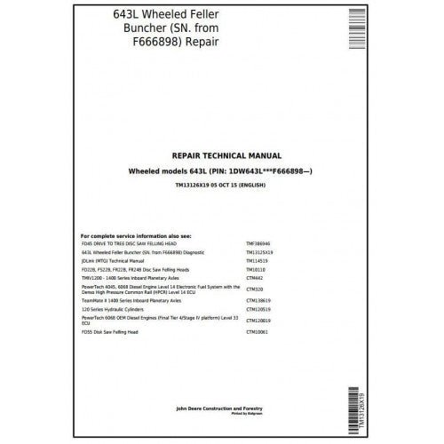 John Deere 643L Wheeled Feller Buncher Pdf Service Repair Technical Manual TM13126X19