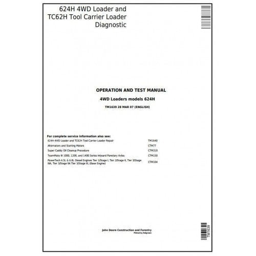 John Deere 624H 4WD Wheel Loader and TC62H Tool Carrier Loader Operation and Test Manual TM1639